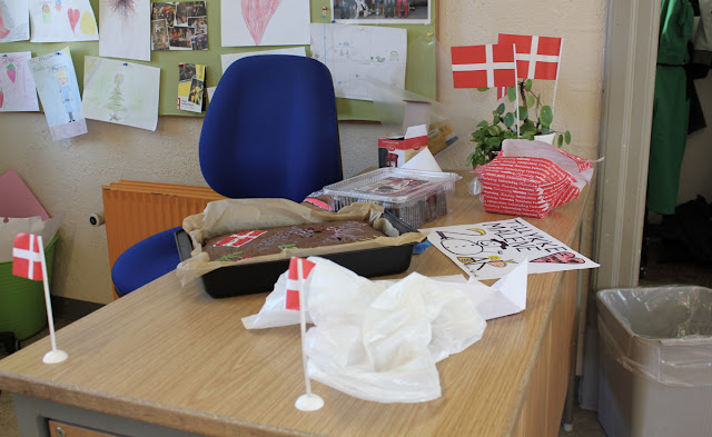 Jeg trådte ind af døren til de dejligste børn, der sang Happy Birthday og et klasselokale i forklædning. Fest-forklædning! Der var hilsner og flag her, der og alle vegne. Selv i loftet. Og hjemmebag og flødeboller og gaver og… Jeg tør slet ikke tænke på, hvor meget kage jeg har fortæret i dag.